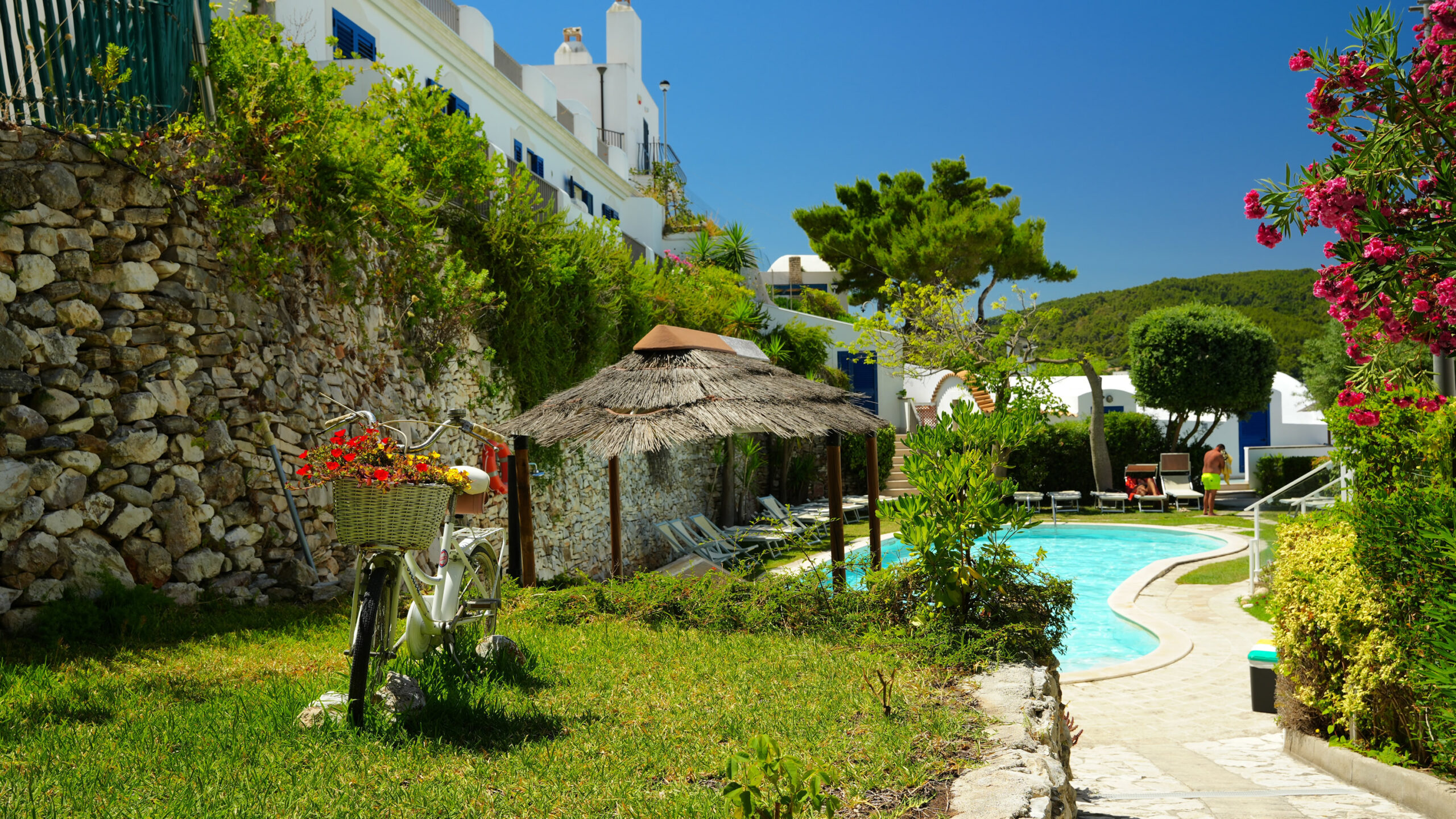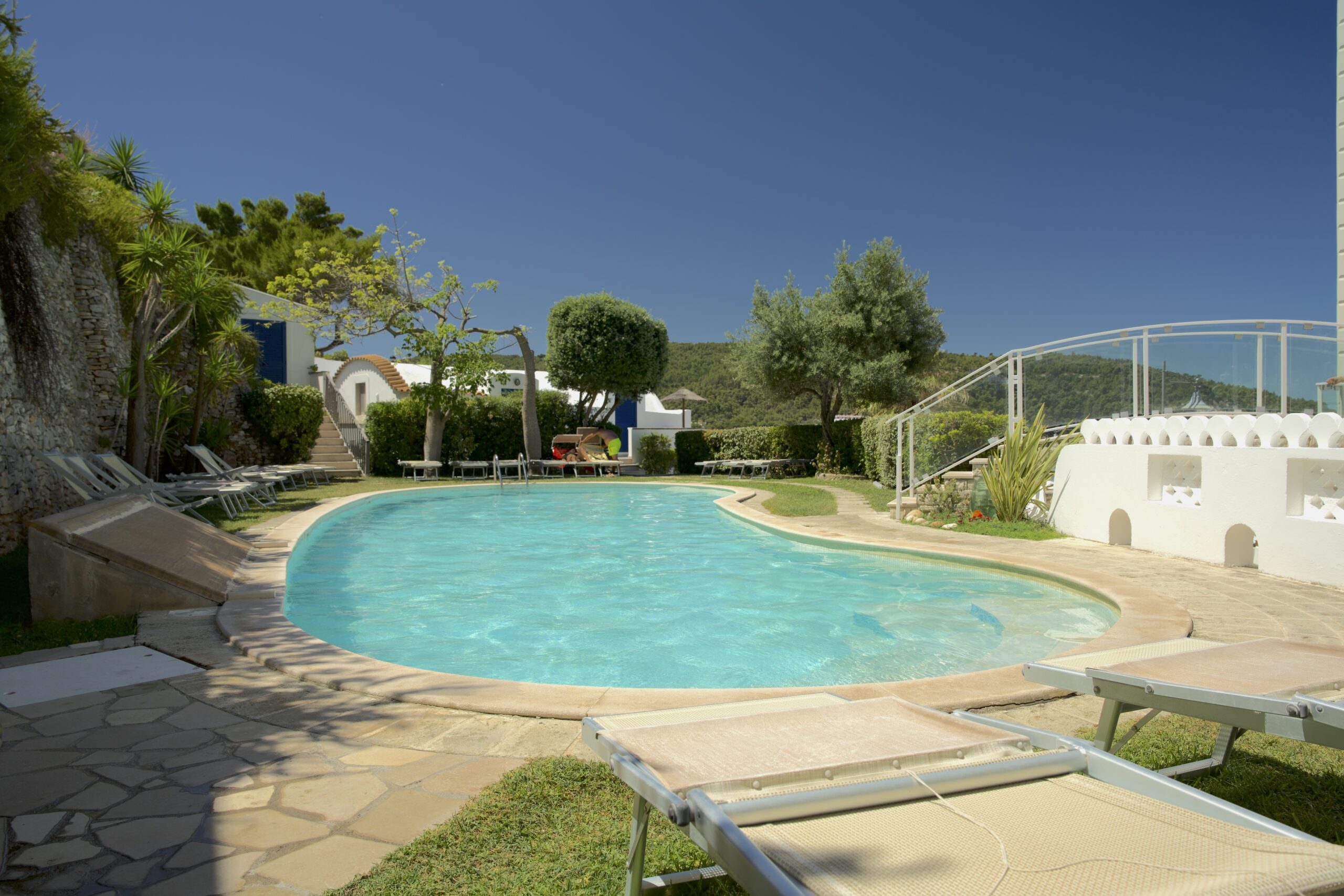 Circondata da un meraviglioso giardino con fiori colorati, la piscina si fonde armoniosamente con l’ambiente circostante. L’ampio solarium è attrezzato con comodi lettini e ombrelloni, ideali per chi desidera rilassarsi al sole dopo un tuffo rinfrescante.